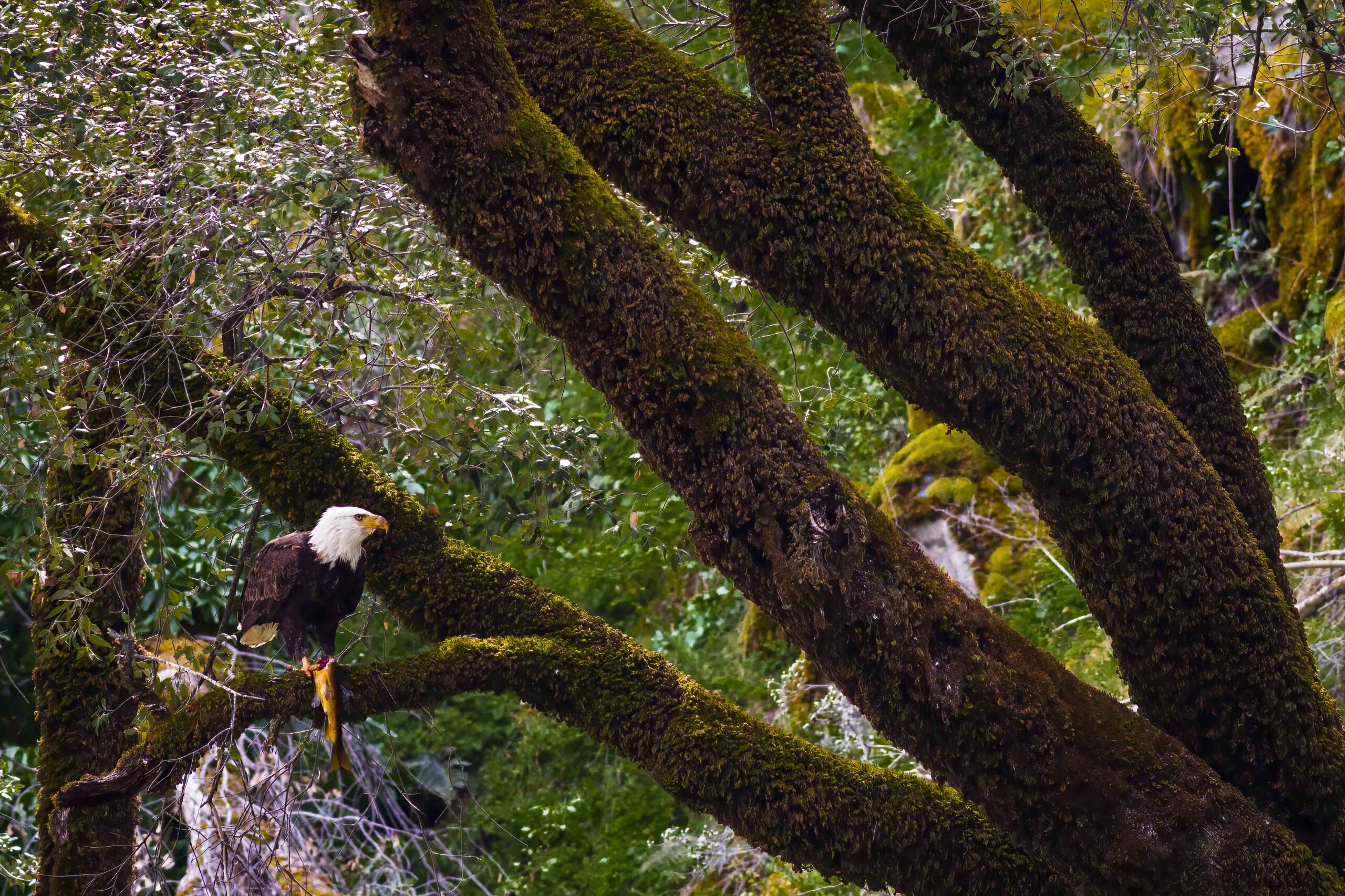 Bald Eagle with captured out on the Merced River. Photo by Robb Hirsch.