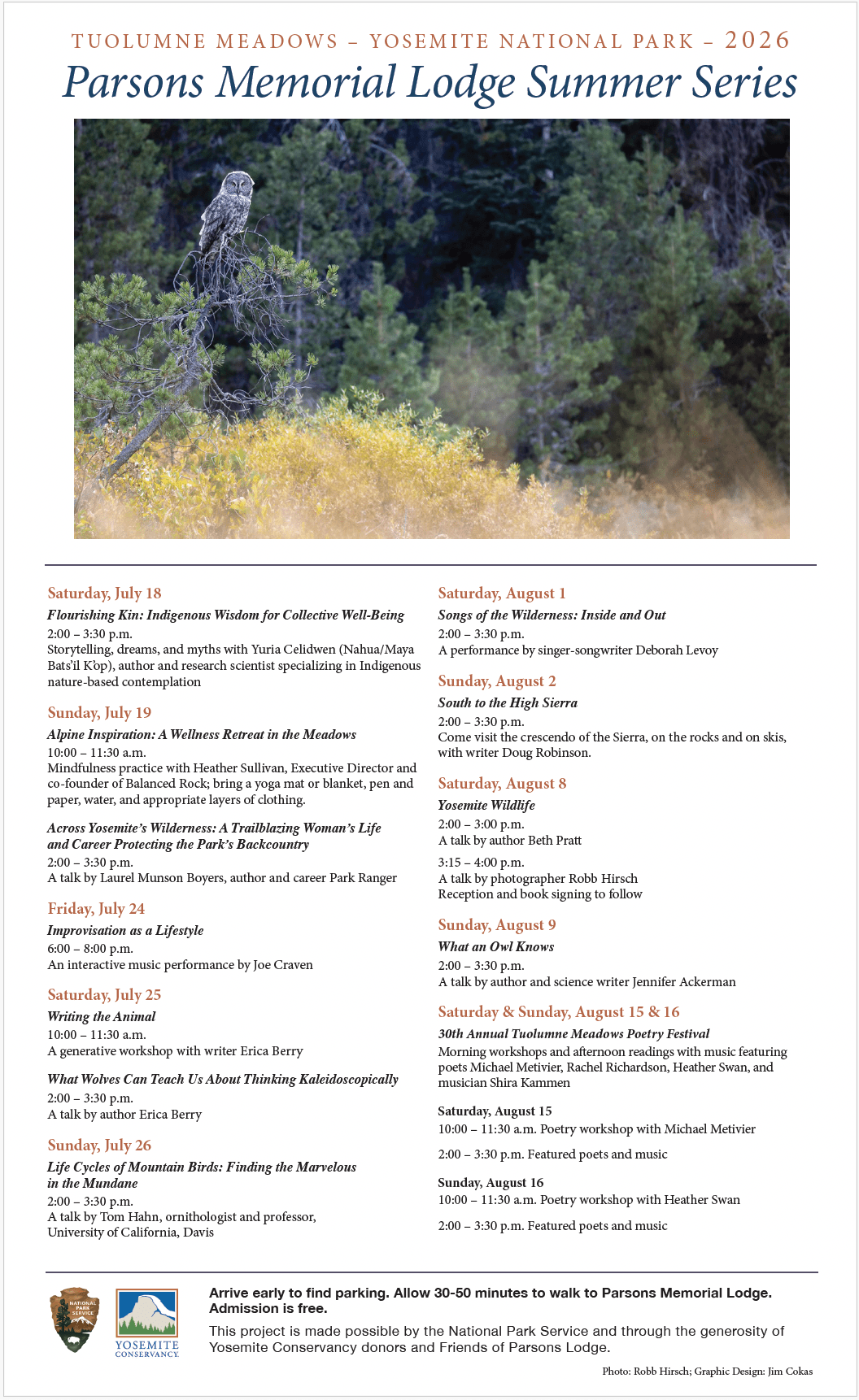 This year also marks the 30th anniversary of the Annual Tuolumne Meadows Poetry Festival, which takes place on the final weekend of the events series. See the full schedule below or in the flyer to the right.